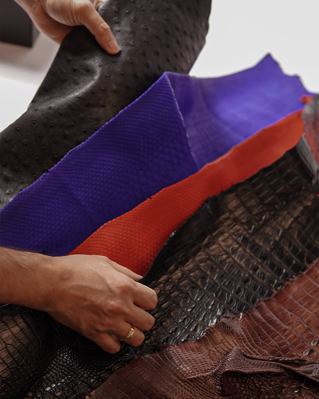 Only the finest quality materials are hand selected for use from renowned international tanneries and suppliers who specialize in everything from Exotics such as Python, Croc and Ostrich to premium grade Calf, Cow, Lamb, Suede or Nubuck.